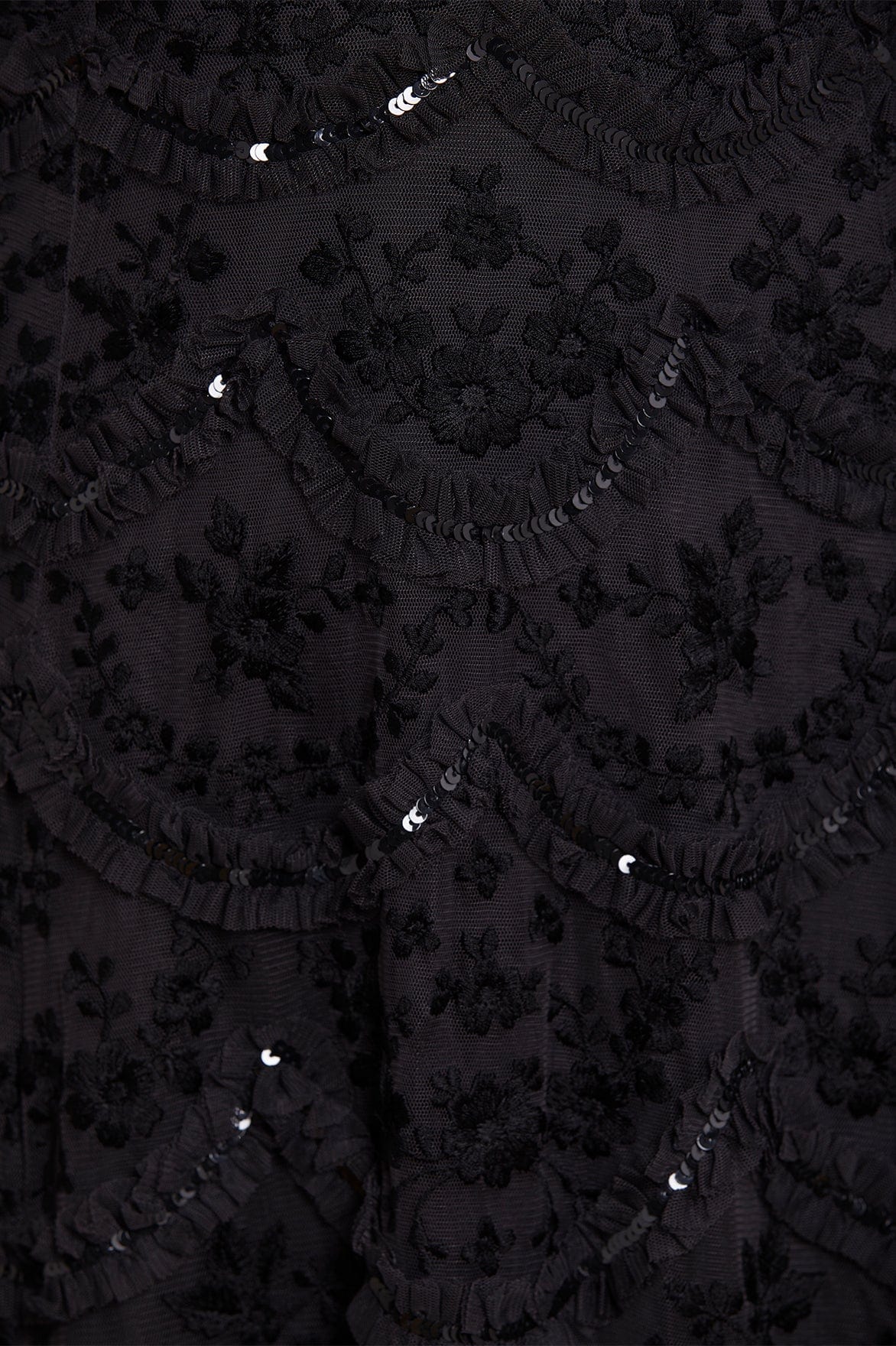 - Tulle decorated with tonal embroidery, iridescent sequins and gathered ruffles