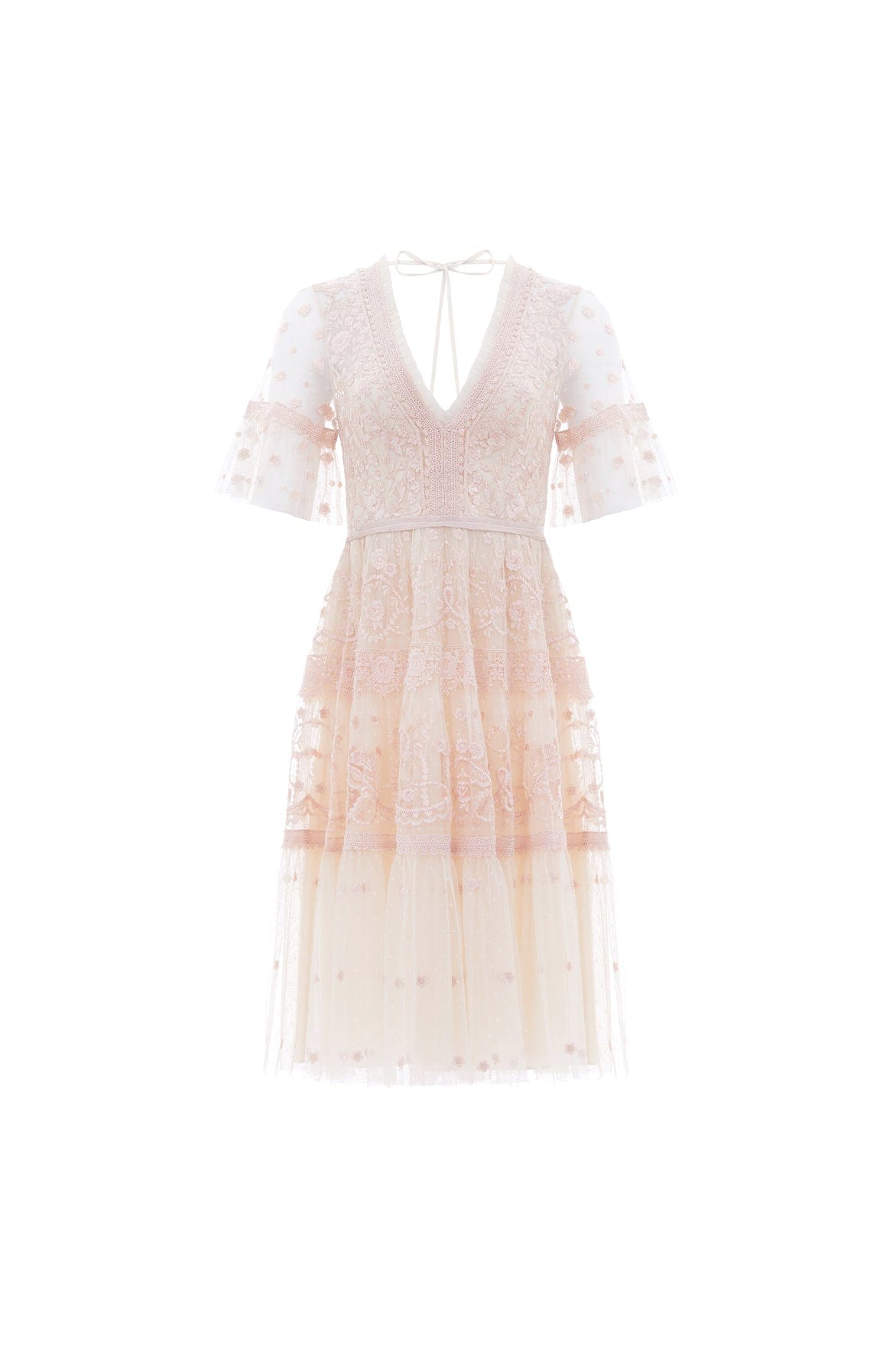 Midsummer Lace Dress in Champagne/Ballet Slipper. A signature Needle and Thread style, updated for the new season ahead. Taking inspiration from Victorian lace, the Midsummer features intricately embroidered artwork in romantic colours on delicate tulle. Lace trims border the neckline and frame each tier of the skirt. This embroidered lace dress has sheer, romantic sleeves and our signature grosgrain ribbon at the waist. The perfect dress to take you from day to night.