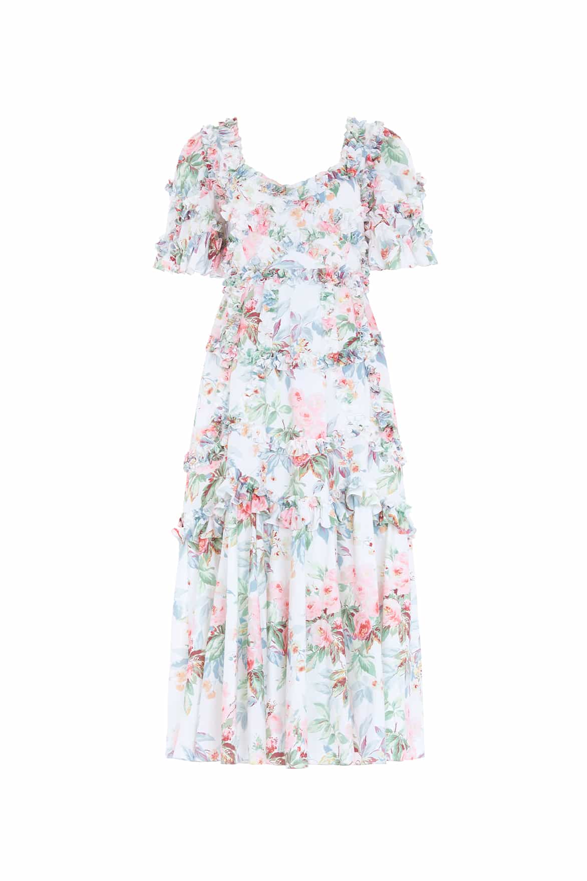 -Form fitted through the bodice with relaxed sleeves and multi-layered skirt