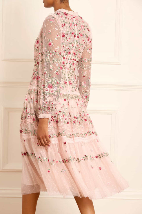 NEEDLE & THREAD EXCLUSIVE. The Ribbon Bouquet Midaxi Dress in Petal Pink. This midaxi dress is intricately designed with embroidered bouquets of flowers in rich tones, inspired by a 1930s vintage print. Beautifully adorned with delicate lace trims for signature Needle & Thread detailing. The skirt is developed with layers of tulle to create a romantic silhouette. The perfect dress for an upcoming occasion.