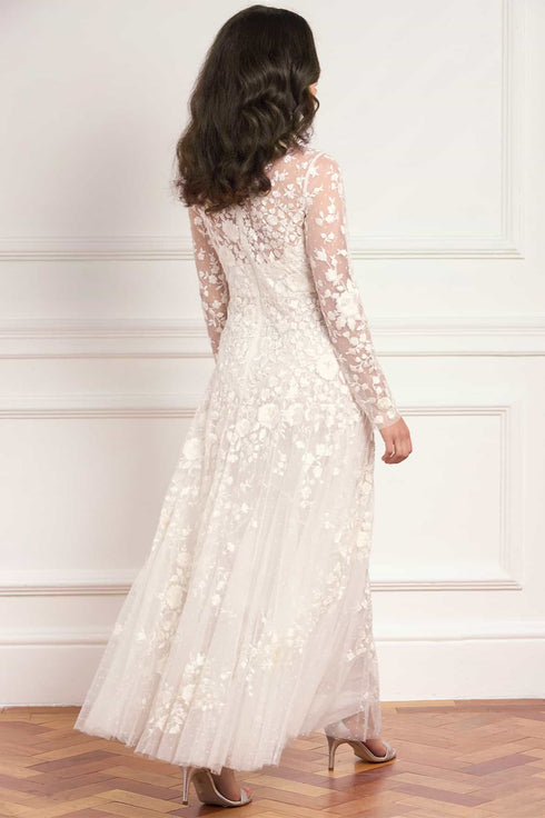 NEW SEASON. The Rosa Round Neck Ankle Gown in Swan White/Cream. Inspired by romantic garden florals, this elegant gown features delicate Rosa embroidery arranged across a softly flowing silhouette. Designed with a round neckline and ankle-length skirt for timeless, refined occasionwear.