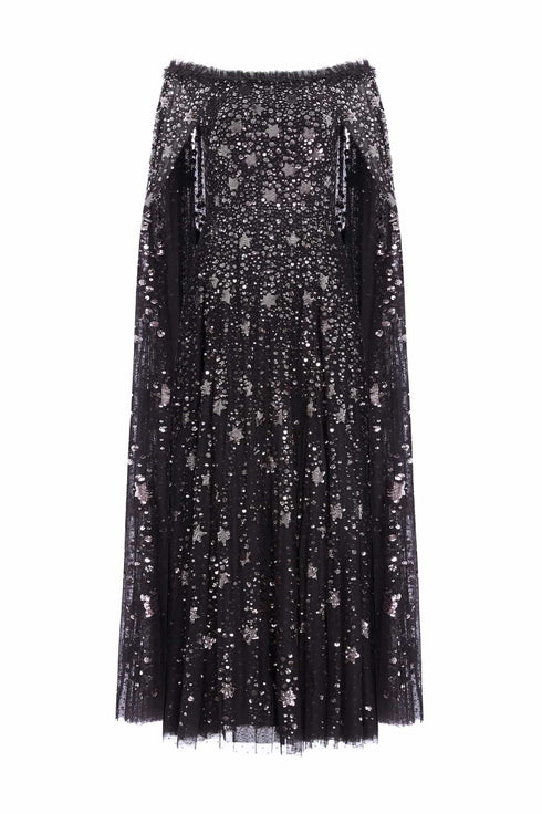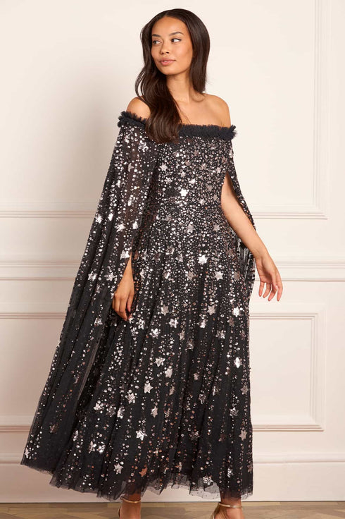 The Shooting Stars Cape Ankle Gown in Graphite/Gunmetal. This gown is adorned with shimmering embellishments of intricate star motifs, with clusters of tiny sparkling sequins that scatter towards the hem, creating a breathtaking effect. Inspired by the extravagant costumes worn by the Follie’s dancers of the early 1900s, this statement gown features an exquisite, embellished cape integrated into the gown. The elegant, flattering neckline is adorned with signature Needle & Thread frills, while the skirt is developed of layers of signature Needle & Thread soft tulle for romantic styling.