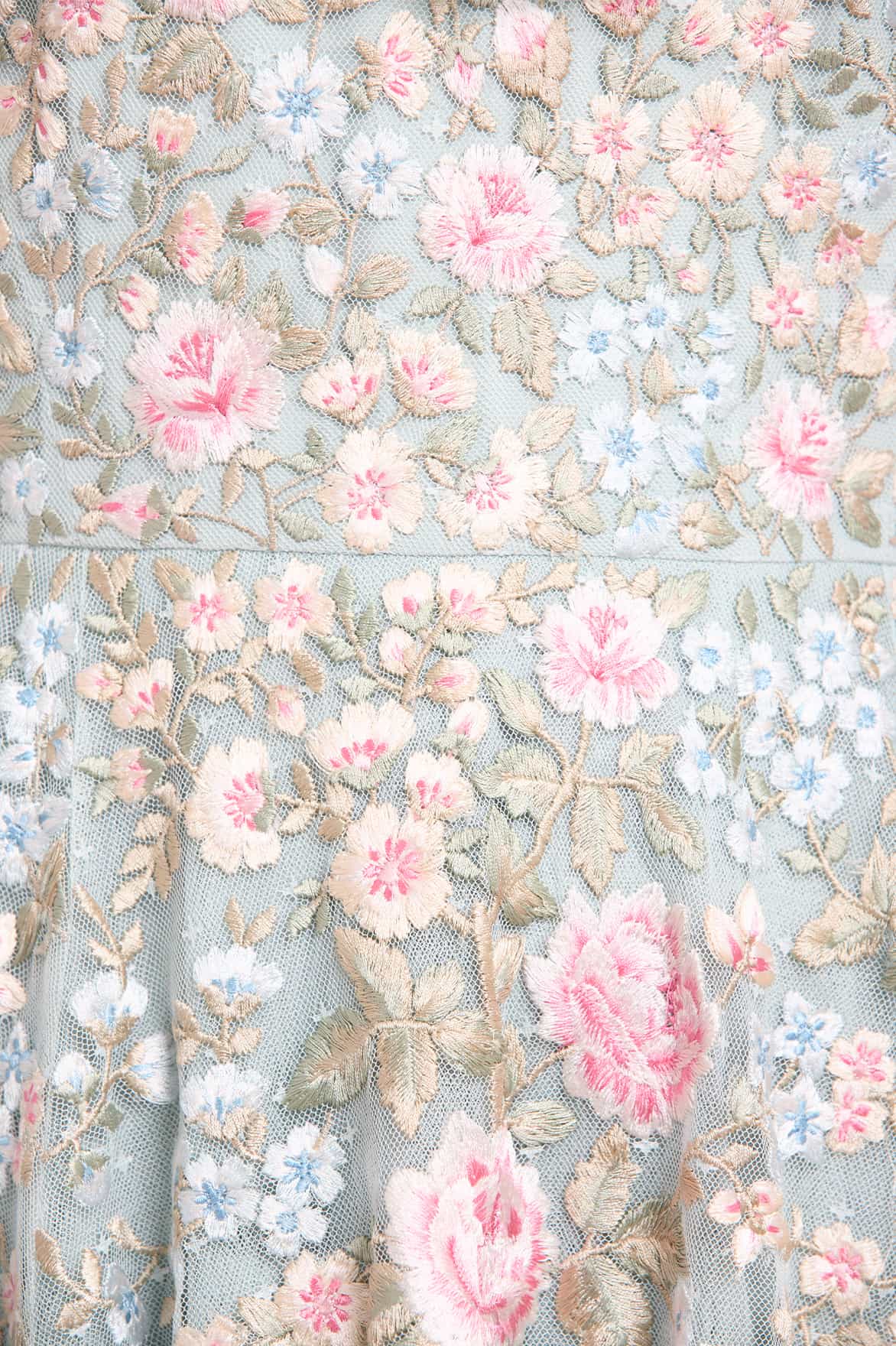 The Antoinettes Floral Off-Shoulder Ballerina Dress in French Blue. Inspired by the grandeur of Versailles, this ballerina dress features delicate, multicoloured floral embroidery trailing elegantly to the hem. The off-shoulder neckline is framed with playful circle-cut frills, while layers of soft net and tulle create a full, floaty skirt with a sweeping finish. A magical blend of romance, drama, and fairytale charm.
