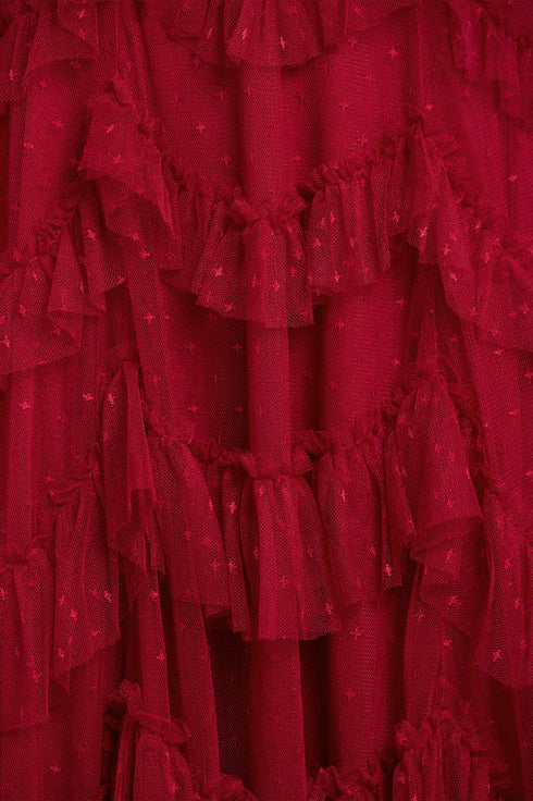 NEW SEASON. The Aviana Short Sleeve Gown in Red. Statement romance meets elegant ease. Featuring delicately gathered scallop frills arranged in flowing tiers, this version of the Aviana silhouette is balanced by short sleeves and a structured bodice. The bold red colour is perfect for making an entrance — a modern classic for festive evenings.