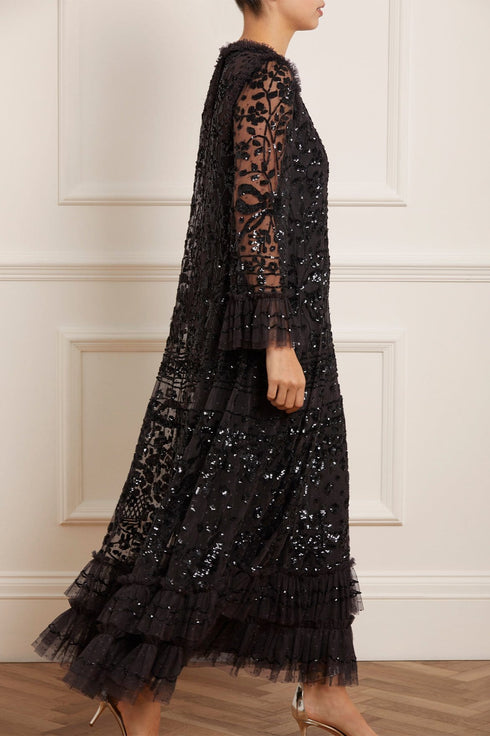 The Celia Long Sleeve Ankle Gown in Graphite. This statement gown is designed with romantic artwork featuring ornate florals, ribbon bows densely filled with shimmering sequins and exquisite detailing. Crafted to produce an effortless, loose fit with soft, playful tulle frills on the hem and cuffs. A key piece in our collection.