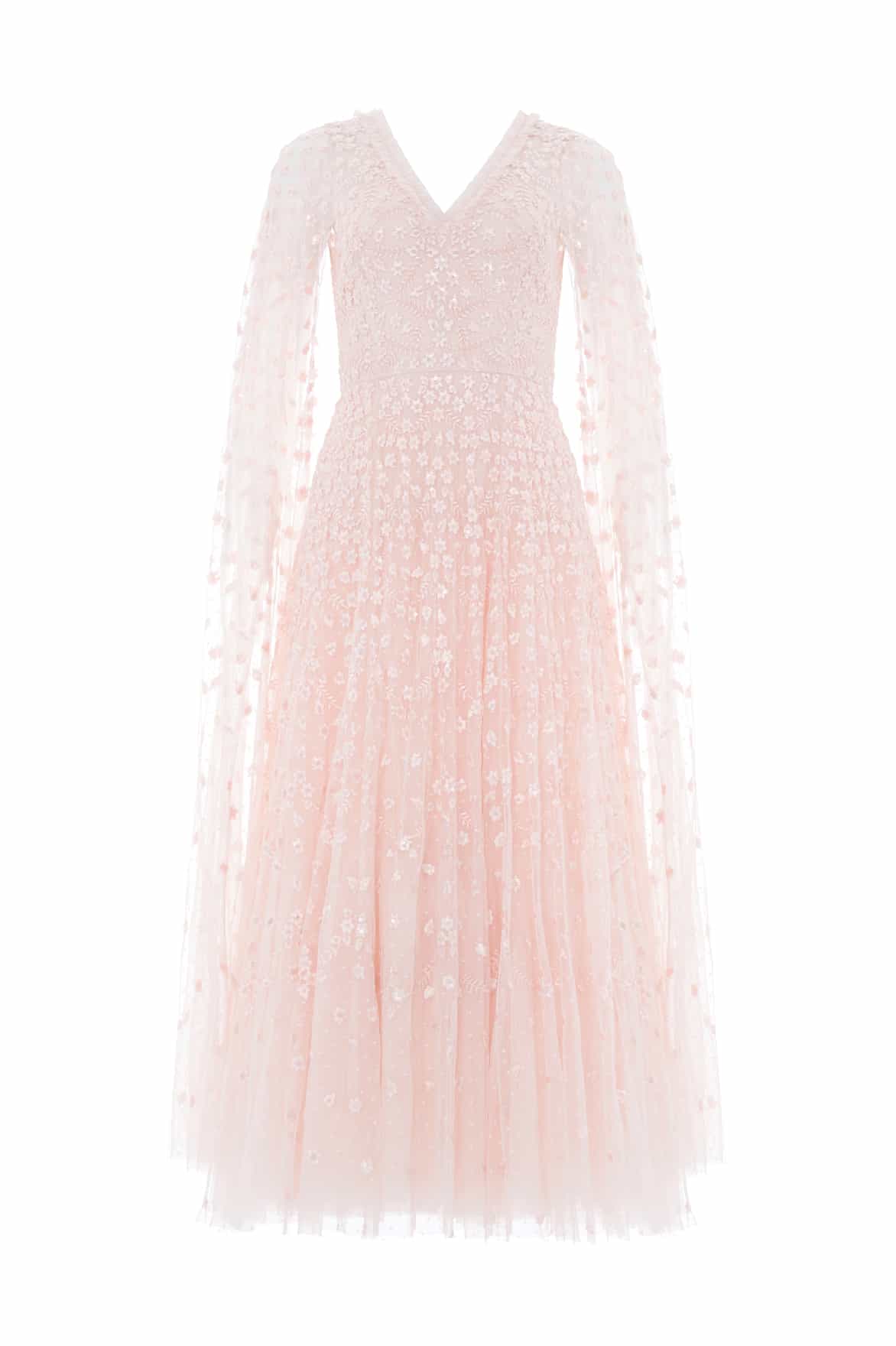 The Clover Cape Sleeve Ankle Gown in Opal. A graceful statement style with early 20th-century influences. Intricate floral embroidery with shimmering sequins trails across the bodice and cape sleeves, gradually softening into swirling motifs near the hem. The opal tone enhances the gown’s dreamy femininity, ideal romantic evenings.