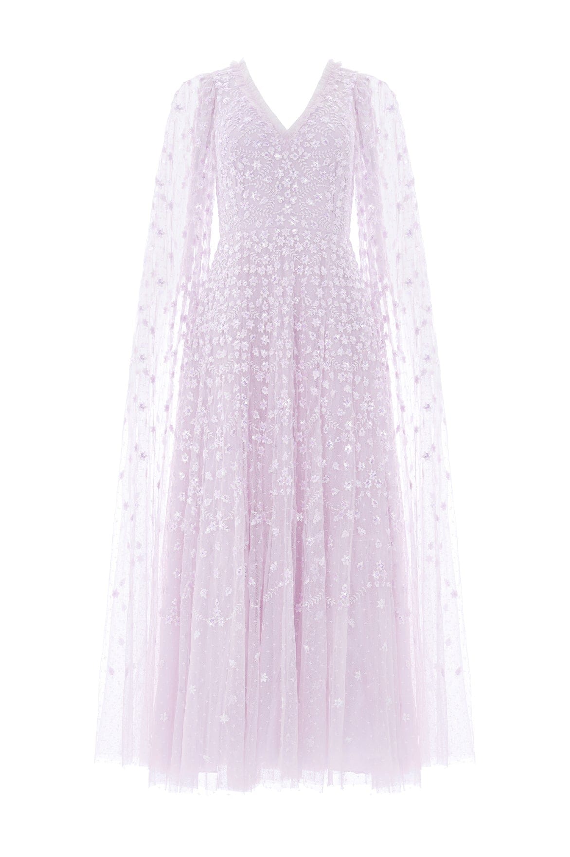 NEW SEASON. The Clover Cape Sleeve Ankle Gown in Powder Lilac. Features fluid cape sleeves and a soft flowing silhouette inspired by painted English gardens. Designed to move beautifully, this style offers effortless elegance for special occasions.