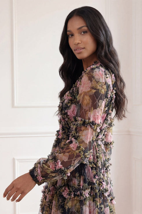 The English Rose Diamond Ruffle Gown in Graphite. This gown is inspired by a traditional rose print taken from a 1900s hand-painted artwork, in soft hues of deep pinks. Developed with signature Needle & Thread styling featuring perfectly engineered frills for all-over delicate texture. The perfect gown to take you from dinner to the dancefloor.