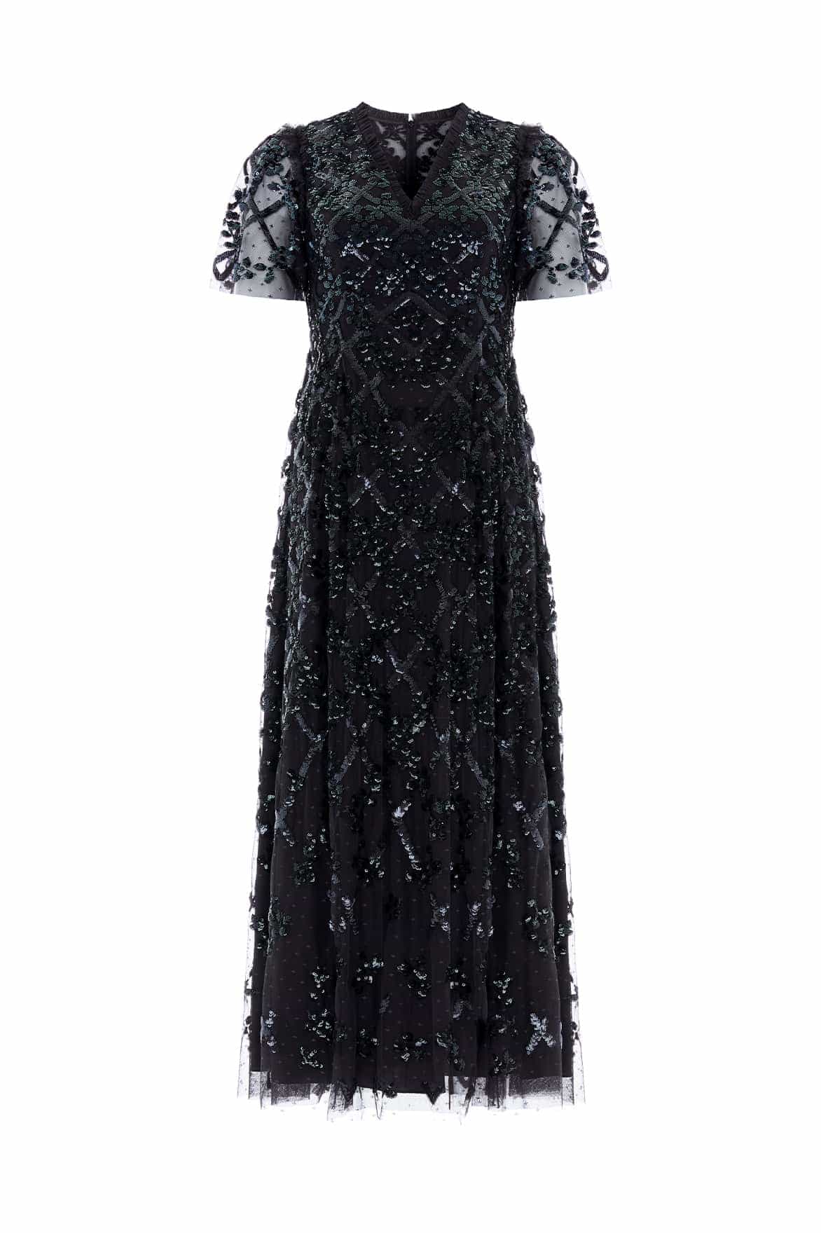 The Garden Lattice Ankle Gown in Graphite. This gown is designed with beautiful artwork incorporating delicate florals in a grid layout. Decorated with two sequin colours to highlight the definition of the design. Crafted with a V-shaped waist creating a flattering, easy-to-wear silhouette. Make a statement this season in the Garden Lattice.