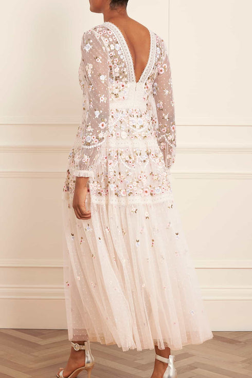 The Garland Ribbon Ankle Gown in Cream This embroidered gown is inspired by Victorian lace trims. Beautifully designed with floral embroidery in soft pastel tones. Developed with a V-shaped waist seam to create a flattering, effortless fit. This gown is adorned with intricate lace trims for signature Needle & Thread detailing. A pretty piece you'll forever treasure.