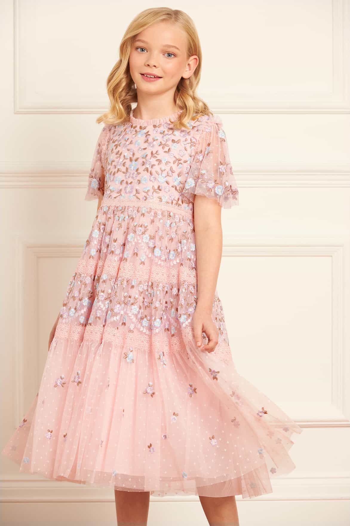 The Garland Ribbon Kids Dress in Dusk Pink. This enchanting dress features intricate embroidery inspired by Victorian lace, with delicate pastel florals and fresh white accents. The tiered skirt, adorned with signature Needle & Thread detailing, adds a touch of magic. A perfect fairytale piece for your little one’s special occasions.