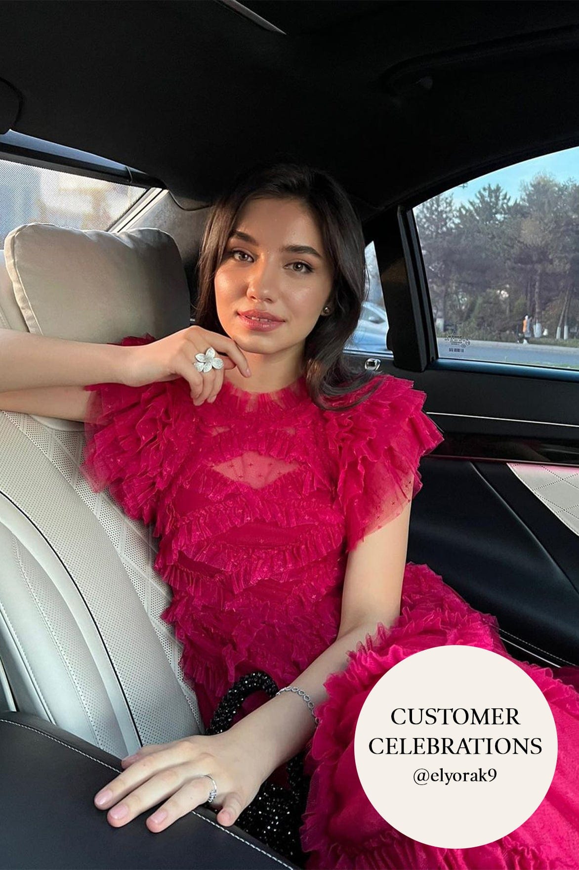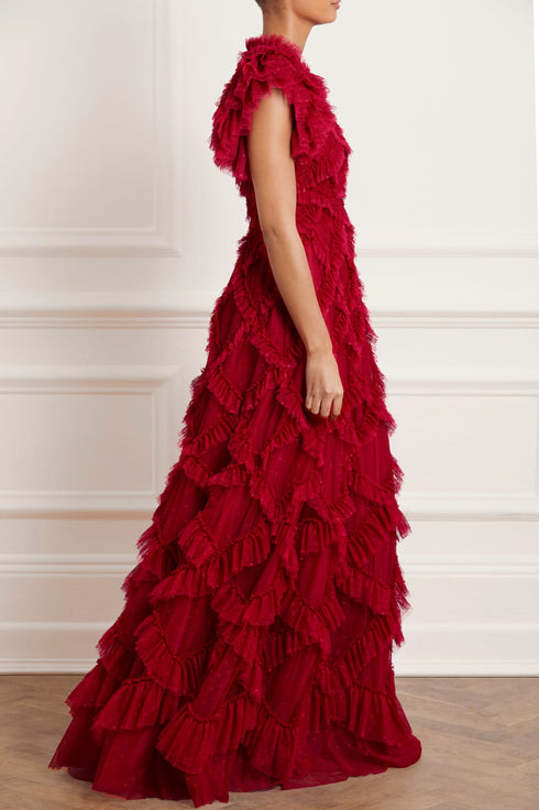 The Genevieve Rose Gown in Red. This statement gown is inspired by 1930s Hollywood glamour. Beautifully designed with diamond tulle details and trims. Crafted with multiple layers of ruffled, frothy tulle sculpted for dramatic effect. Make the ultimate style statement this season.
