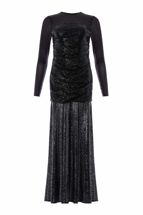 NEW SEASON. The Josephine Long Sleeve Gown in Graphite. Evoking the night sky, this gown is inspired by the Bright Star collection’s cosmic narrative. The gown glistens with all-over sequins, recalling constellations shimmering against dark skies. Sculptural drapes contour the figure, while powermesh sleeves provide comfort and ease. Moody and romantic, this gown embodies celestial grandeur.