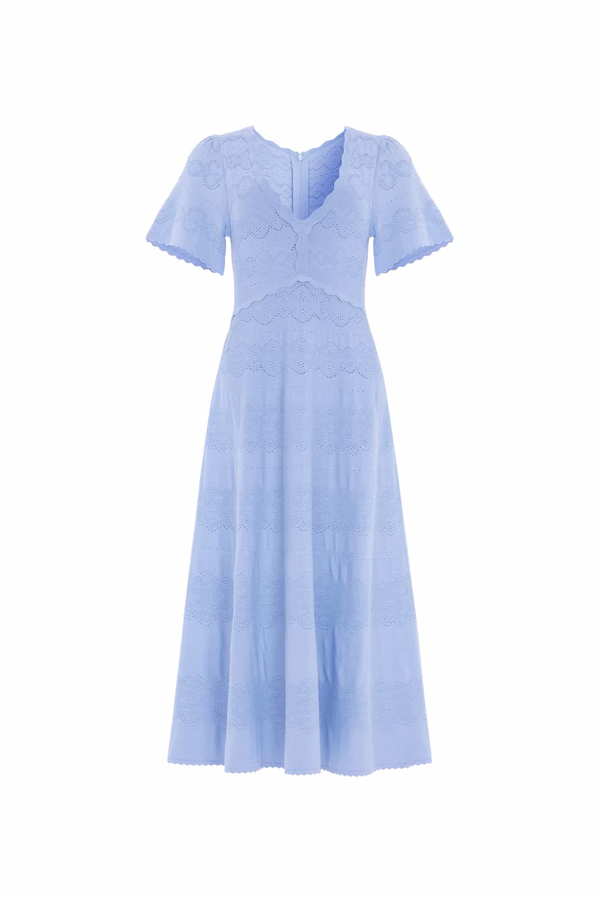 NEW SEASON. The Lace Knit Gown in Iris Blue. This knitted gown is developed from recycled viscose blend, with stretch yarn for a beautiful, flattering texture. Decorated with stitch pointelle details inspired by vintage woven lace ribbons. Crafted with a fitted stretch bodice, a feminine V-neckline and scalloped trim details for a romantic look. This easy-to-wear piece is the perfect wardrobe staple.