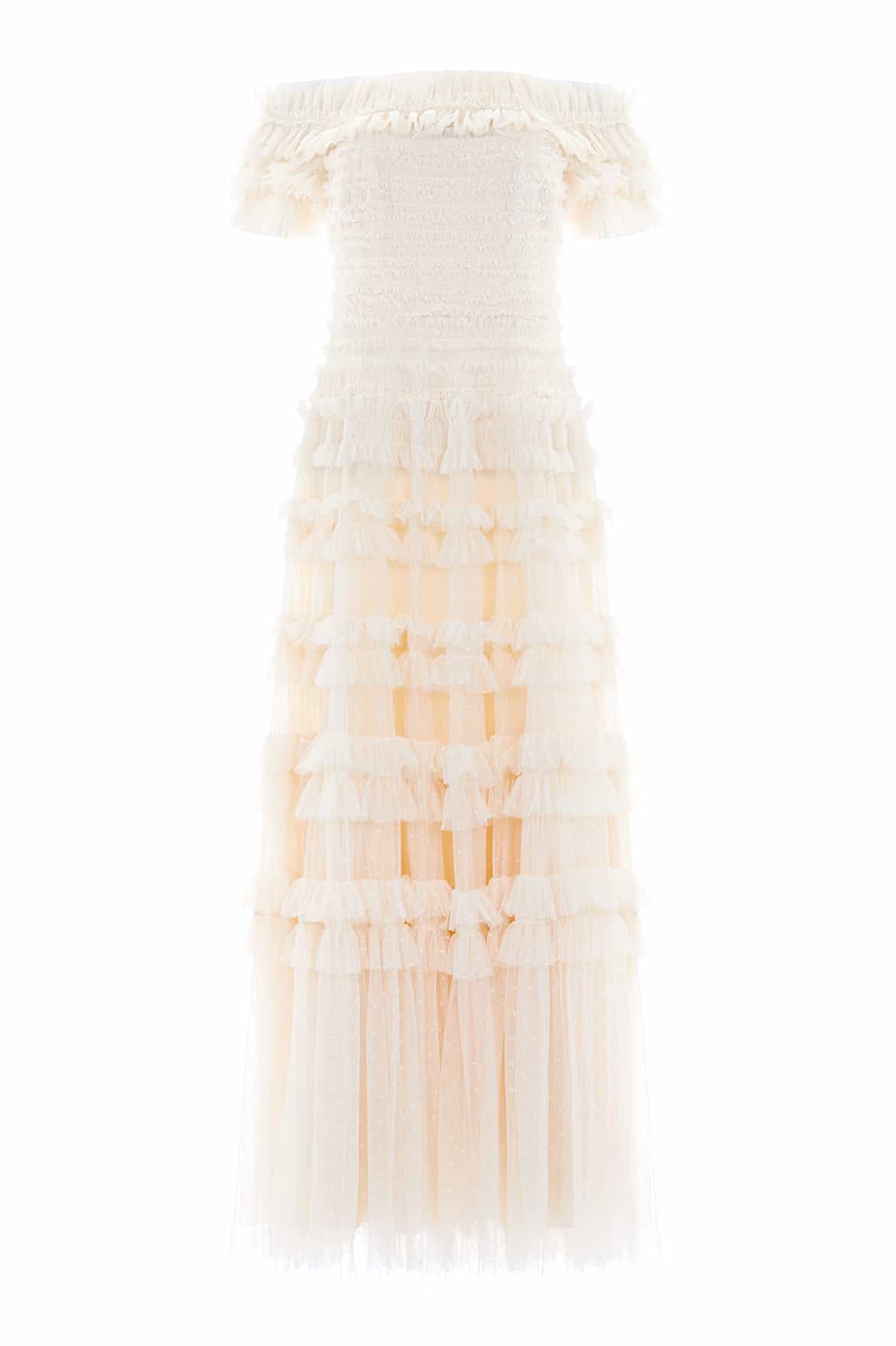 The Lisette Ruffle Off Shoulder Gown in Champagne. This statement gown has an elegant off-the-shoulder design inspired by Hollywood styling. Crafted with textile tulle and double-stitched frills for a dramatic, romantic effect. Features an integrated corset for a perfect fit and to hold the silhouette. Expect all eyes on you in this romantic gown.