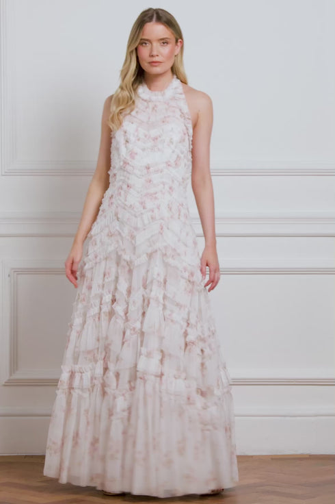 NEW SEASON. The Magnolia Ditsy Elia Halter-Neck Gown in Moonshine/Seashell. Adorned with whimsical floral motifs that scatter across soft tulle. Designed with a halter neckline and timeless ruffles, this gown perfectly balances modern simplicity with romantic detail.
