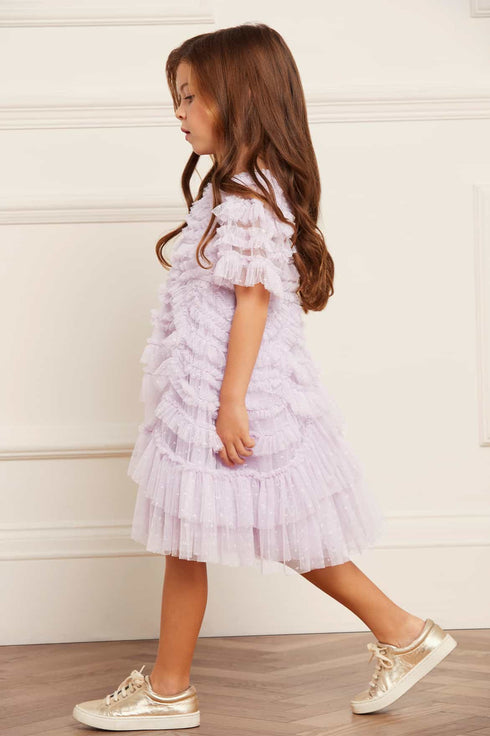 The Marilla Ruffle KIDS Dress in Lilac. Beautifully designed with frothy tulle and interlocking scallop shapes to create a playful texture. This pretty style features elegant short sleeves, a round neckline and a full skirt. The perfect statement style for your little one.