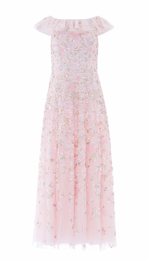 NEW SEASON. The Peony Bouquet Sequin Ankle Gown in Peony Pink/Multi. This elegant gown is embellished with tiny glittering sequins forming romantic garden florals inspired by archival artwork. Designed with a flowing ankle-length silhouette, the embellishment cascades softly towards the hem for a luminous finish.