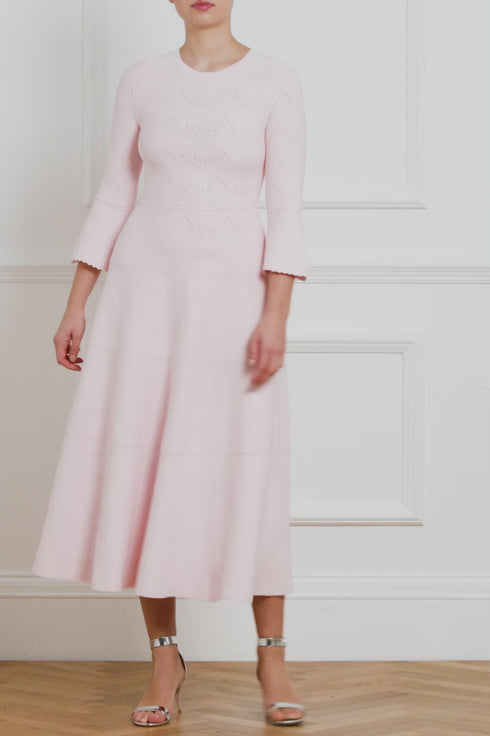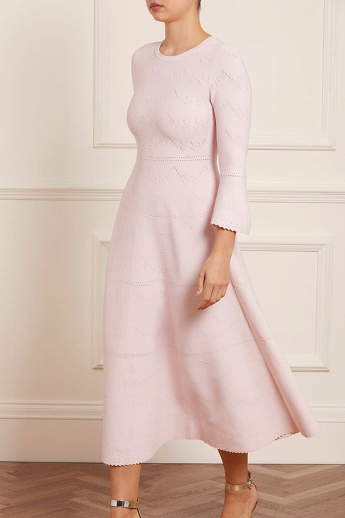 The Pretty Pointelle Knit Ankle Gown in Pink. A brand new style for Needle & Thread. This knitted gown is inspired by vintage ditsy florals and lace. Beautifully designed with all-over pretty pointelle stitch, delicate florals and scallop details. This gown has a fitted stretch bodice with a soft, round neckline, fluted cuffs and signature Needle & Thread detailing. A truly flattering piece.