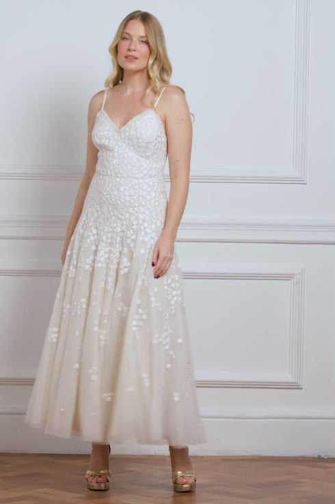 NEW SEASON. The Scatter Blossom Cami Ankle Gown in Cream. Decorated with whimsical tonal embroidery and dainty florals. Crafted from delicate tulle with a softly flared skirt, this romantic gown embodies poetic elegance.