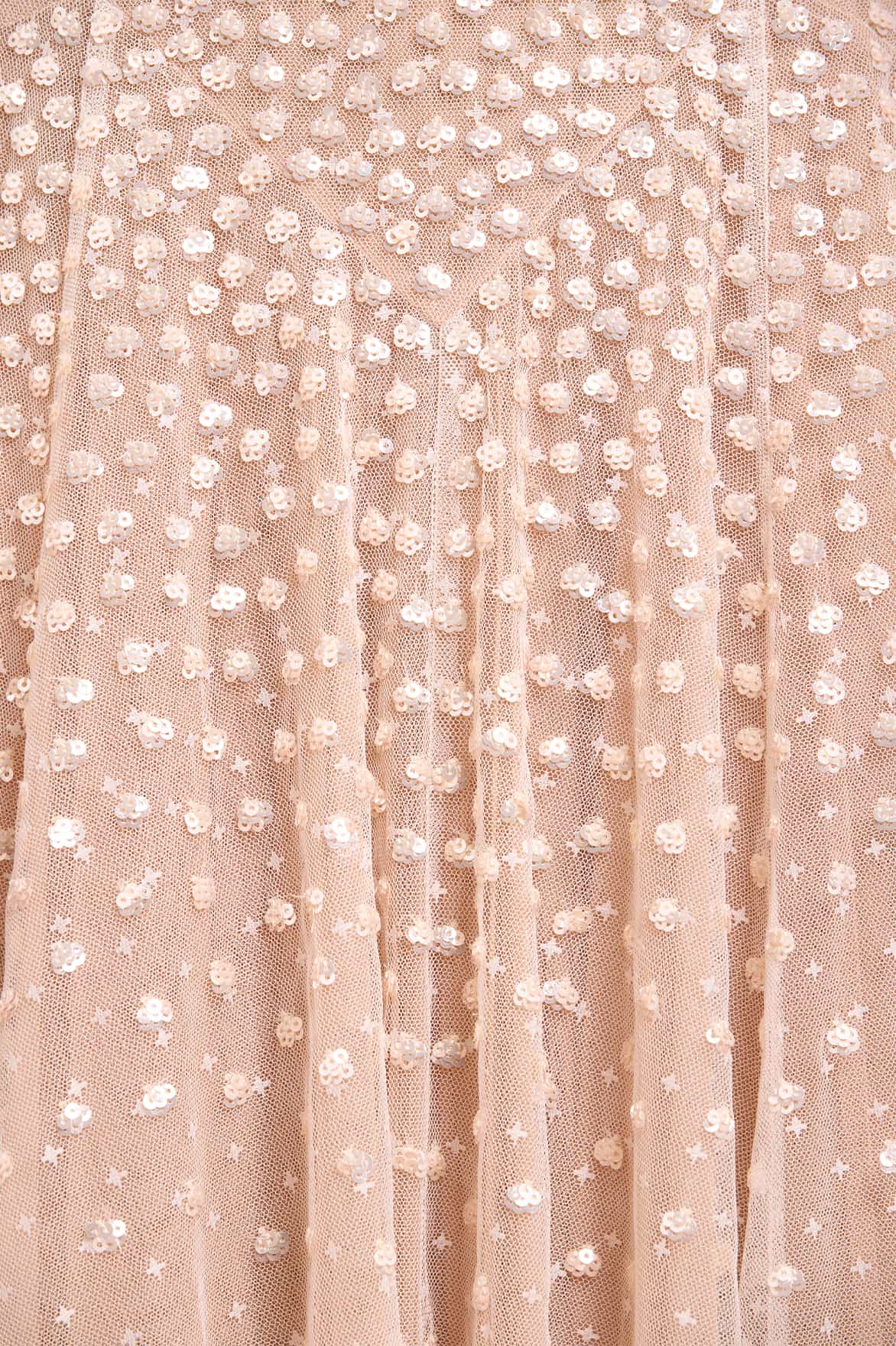 The Sequin Cascade Round Neck Gown in Cream/Butterscotch. This graceful gown is adorned with shimmering sequin dot motifs, crafted with a special high-shine foil coating for a radiant, light-catching finish. Intricate chevron seaming sculpts the hips before flowing into a voluminous skirt of layered net and tulle, creating a soft, sweeping silhouette. Finished with a delicate tulle frill at the round neckline and slim sleeves, the design is lined in a contrast hue for a subtle romantic glow. A beautifully crafted piece for truly special occasions.