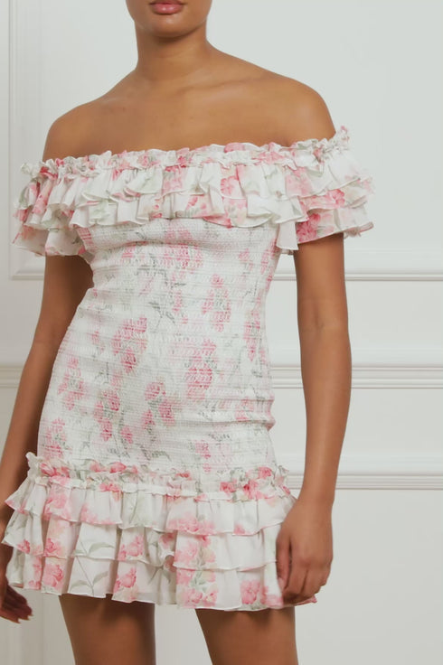 The Summer Posy Chiffon Smocked Micro Mini Dress. Beautifully designed with a perfect summer print taken from a hand-painted artwork from the early 1900s. This mini dress is decorated with pretty posy, floral clusters scattered and dispersed throughout to create an all-over beautiful print. Developed in soft chiffon with a fully stretch elasticated smocking body, adding vintage-inspired detail. Developed with an off-shoulder elasticated design featuring layers of chiffon to create comfort and signature Needle & Thread detailing. The skirt panels are created using layers of chiffon staggered in length to create a playful, frothy silhouette. A piece you'll forever treasure.