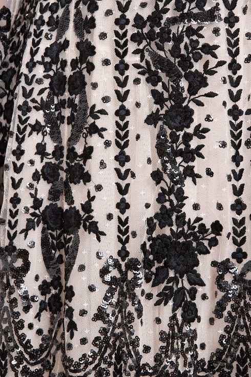 The Adeline Off-Shoulder Ankle Gown in Cream/Graphite. A dramatic take on evening elegance. Delicately embroidered with Victorian-era inspired florals, bows and scallops in contrast graphite thread, this off-shoulder silhouette embraces romance with a contemporary twist. Shimmering sequin embellishments enhance the flattering fitted bodice, while the ankle-length skirt flows into a cascade of softly glinting florals.