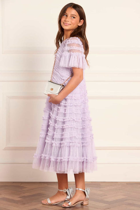 NEW SEASON. The Amara Ruffle Kids Dress in Lavender. Crafted from layers of soft tulle with signature Needle & Thread cascading ruffles. Designed for twirling moments, this dreamy dress brings playful elegance to special occasions.