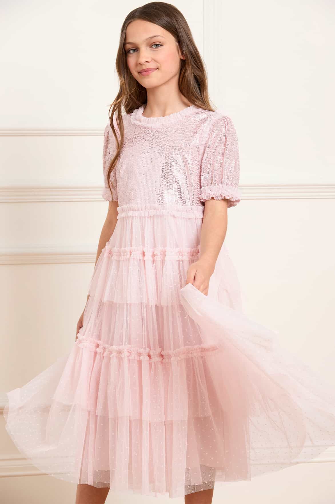 The Annalise KIDS Dress in Dusk Pink. This enchanting dress features a shimmering bodice and puff sleeves adorned with sequins for a glittering finish. Signature Needle & Thread tulle frills trim the neckline, cuffs, shoulders, and waist for a romantic touch. The playful tiered skirt, crafted from soft net and tulle with frothy topstitched ruffles, flows into a sweeping hem—perfect for twirling. A whimsical statement dress for sparkling moments.