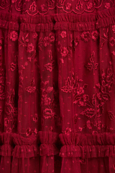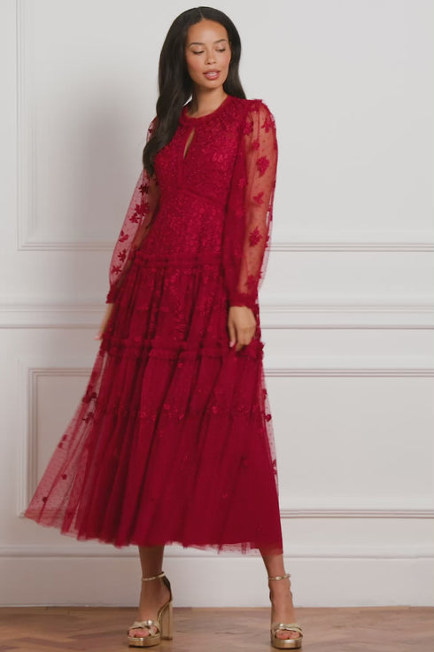The Autumn Lace Long Sleeve Ankle Gown in Red. This signature Needle & Thread style is designed with floral motif embroidery inspired by antique lace designs. This gown is developed with romantic sheer long sleeves, and a gathered tiered hem, and is created from layers of soft tulle to create a flattering silhouette. A classic and contemporary style.