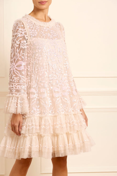 NEEDLE & THREAD EXCLUSIVE. The Celia Long Sleeve Mini Dress in Cream/Dusk Pink. This statement dress is designed with romantic artwork featuring ornate florals and ribbon bows, densely embellished with shimmering sequins for exquisite detailing. Crafted with an effortless loose fit with soft, playful tulle frills on the hem and cuffs. A key piece in our collection.