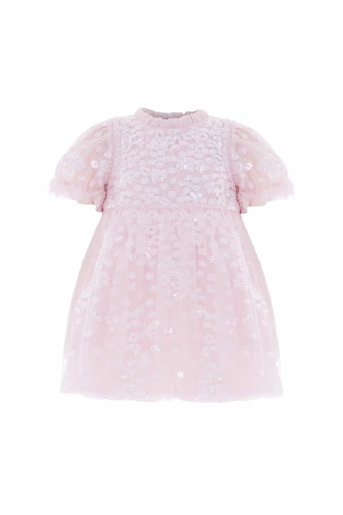 The Confetti Baby Dress in Peony Pink/Cream. This pretty design features sequin-embellished flower motifs that cascade down the dress in a confetti pattern. The puffball skirt is crafted from soft, gathered mesh, while the tulle frills on the neckline and shoulders add a delicate touch. Developed with short puff sleeves finished with ruffled cuffs, and the dress is lined in luxurious cotton voile for comfort. Complete with coordinating cotton dobby bloomers, edged with frills. Let your little one shine in the spotlight.