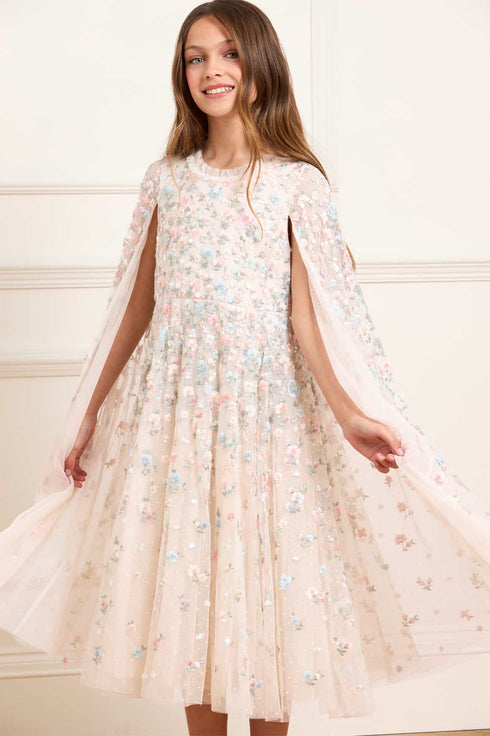 The Dahlia Ditsy Cape Kids Dress in Cream/Multi. This enchanting dress features shimmering sequin dots and delicate floral embroidery. A soft tulle cape, adorned with floral motifs, adds a whimsical touch. With layers of net and tulle for a twirl-worthy skirt, it’s the perfect fairytale dress for your little one’s special occasions.