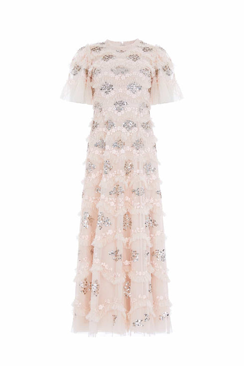 The Daisy Wave Ankle Gown in Dust Beige/Silver. The artwork for this style has been inspired by our 'Daisy Wave' print. Exquisitely detailed textile is created using undulating borders of gathered tulle frills with interspersed intricate lace. Featuring floral artwork with rich, tonal embroidery and shimmering sequins. The perfect gown to take you from day to night.