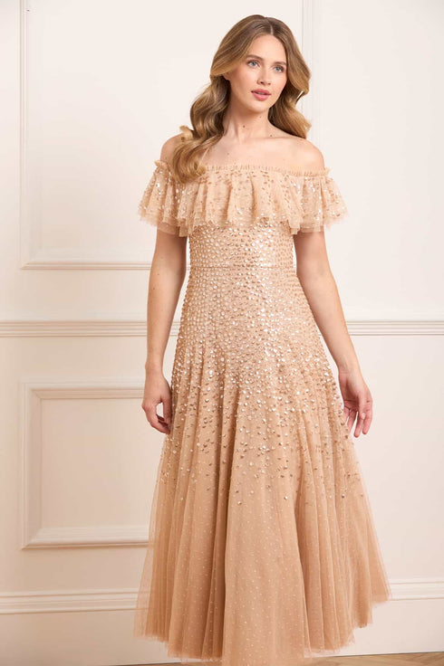 The Dappled Sequin Off-Shoulder Ankle Gown in Butterscotch. This ankle gown features shimmering clustered dot motifs that cascade towards the hem for a radiant effect. Its off-shoulder neckline is adorned with layered circle-cut frills, finished with signature Needle & Thread detailing. The gown is designed with flattering chevron seaming across the hips and a voluminous skirt crafted from layers of net and tulle, creating a dramatic, sweeping hemline. This gown is destined for truly unforgettable moments.