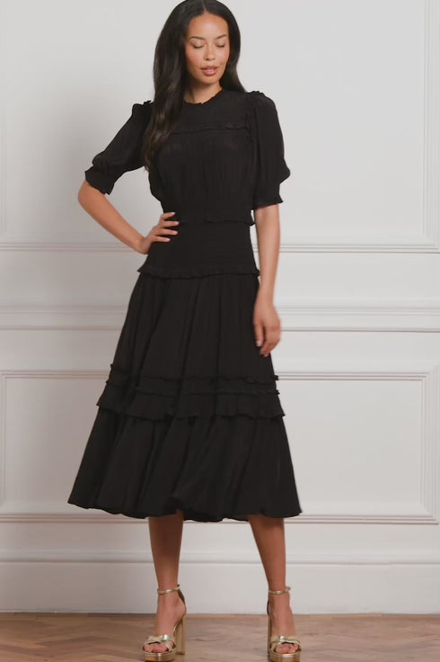 NEW SEASON | NEEDLE & THREAD EXCLUSIVE. The Emilia Crepe Ballerina Dress in Graphite. A versatile mid-length silhouette crafted in a soft matte crepe. This style features a gently fitted waist, soft draping at the neckline, and a flowing skirt for ease and movement. Perfect for sophisticated dressing or minimalist eveningwear.