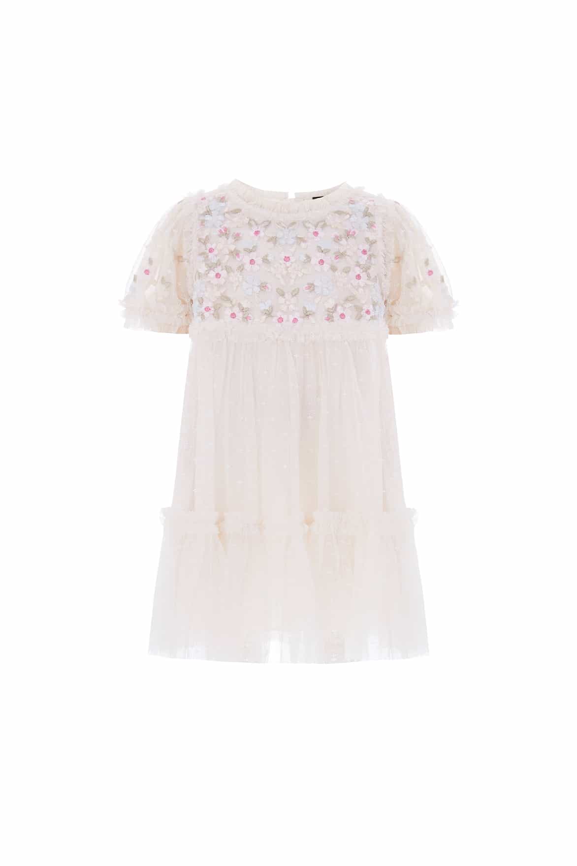 NEW SEASON. The Garland Ribbon Bodice Baby Dress in Cream/Pastel. Features delicate ribbon embroidery and soft tulle layers. With a lightly gathered waist and flutter sleeves, it’s a charming design made for little celebrations. This design pairs beautifully with the Garland Ribbon Ankle Gown from the womenswear line for a harmonious moment.