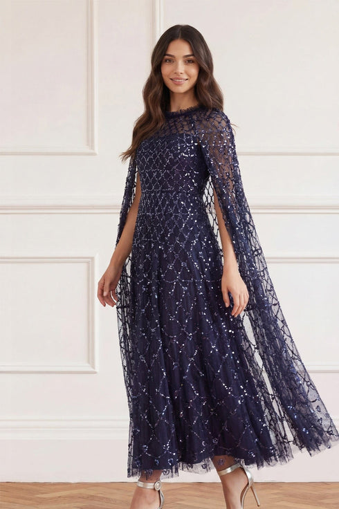 The Heart Lattice Ankle Gown in Midnight. This gown is decorated with intricate embellishments made using the smallest sequins for exquisite detailing. Beautifully designed with heart-shaped motifs in a lattice layout. This gown features our new floor-length cape for romantic detailing and a statement look. Make an entrance at your next event.