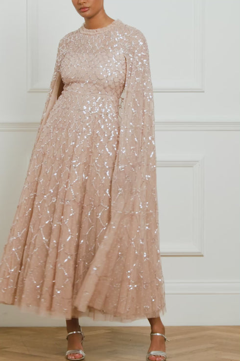 The Heart Lattice Ankle Gown in Rose Gold. This gown is decorated with intricate embellishments made using the smallest sequins for exquisite detailing. Beautifully designed with heart-shaped motifs in a lattice layout. This gown features our new floor-length cape for romantic detailing and a statement look. Make an entrance at your next event.