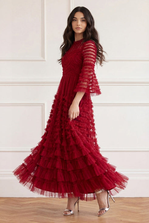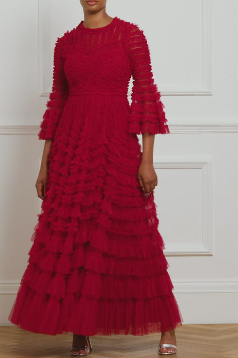 The La Vie En Rose Round Neck Gown in Deep Red. This gown is adorned with delicate tulle ruffles, engineered throughout the panels to enhance the silhouette. Developed with gathered ruffles throughout for a romantic texture. Make a statement in the La Vie En Rose.