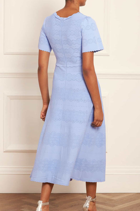 NEW SEASON. The Lace Knit Gown in Iris Blue. This knitted gown is developed from recycled viscose blend, with stretch yarn for a beautiful, flattering texture. Decorated with stitch pointelle details inspired by vintage woven lace ribbons. Crafted with a fitted stretch bodice, a feminine V-neckline and scalloped trim details for a romantic look. This easy-to-wear piece is the perfect wardrobe staple.