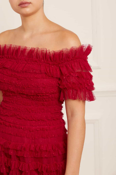The Lisette Ruffle Off Shoulder Gown in Deep Red. This statement gown has an elegant off-the-shoulder design inspired by Hollywood styling. Crafted with textile tulle and double-stitched frills for a dramatic, romantic effect. Features an integrated corset for a perfect fit and to hold the silhouette. Expect all eyes on you in this romantic gown.
