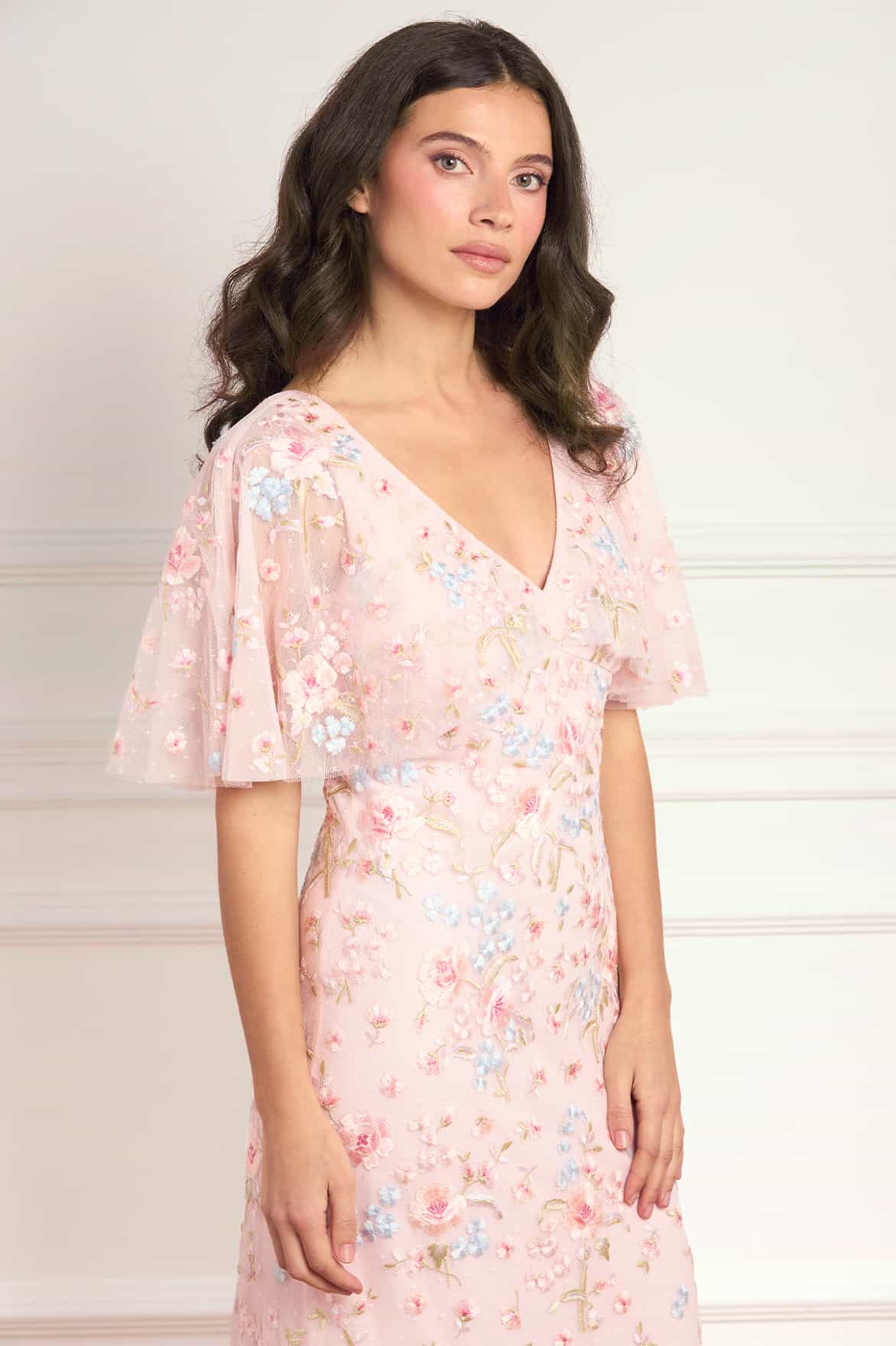 NEW SEASON. The Peony Bouquet V-Neck Cape Gown in Peony Pink/Multi. Romantic floral embroidery cascades across this gown, inspired by antique botanical artwork. Finished with an integrated cape and a slim silhouette, with a bias-cut lining for fluid movement and refined occasionwear styling.