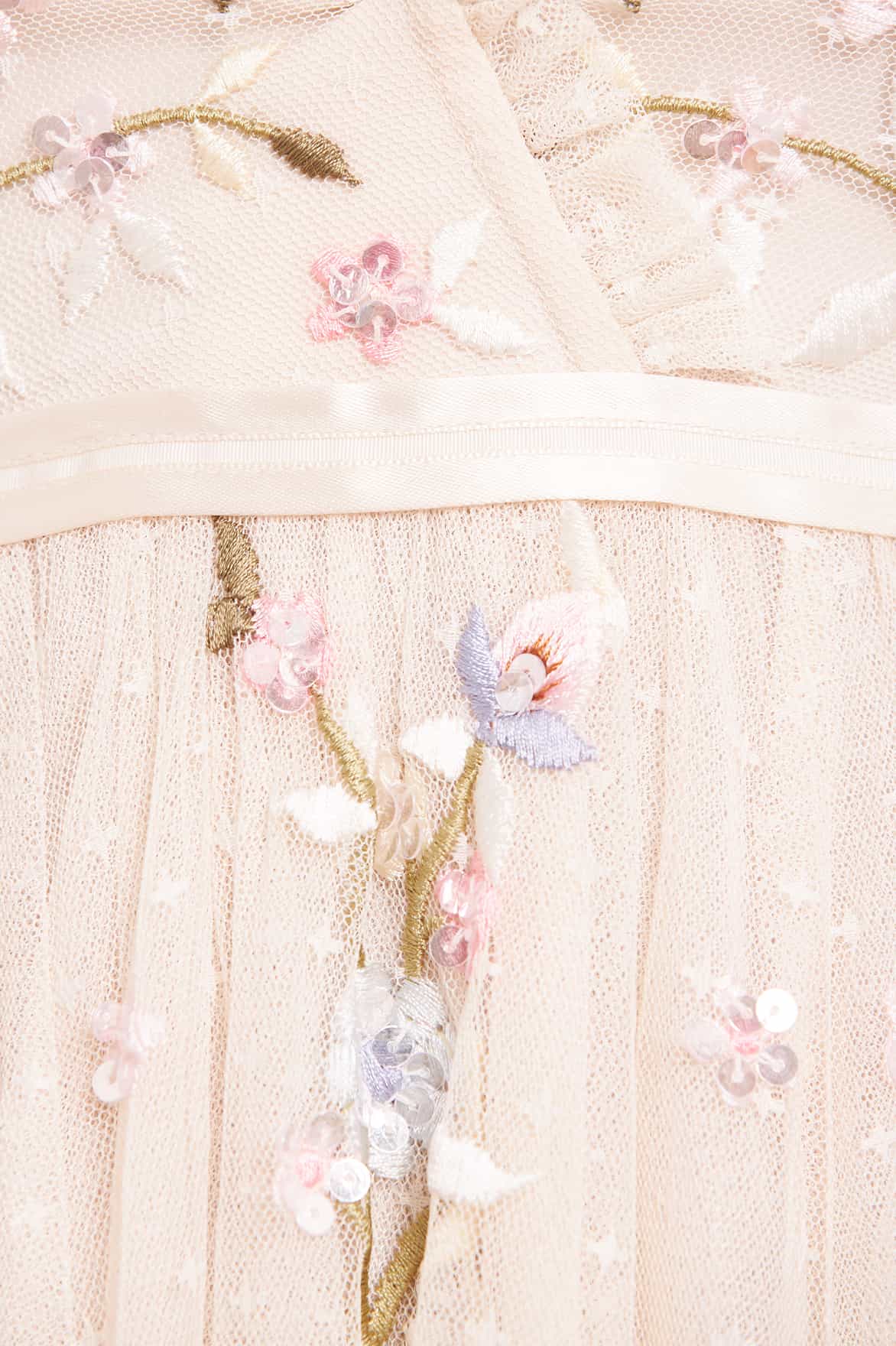 - Tulle decorated with multi-coloured floral embroidery and iridescent sequins
