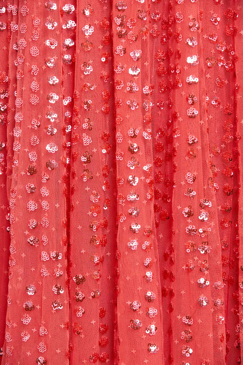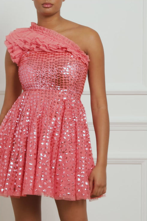 The Raindrop One Shoulder Micro Mini Dress in Pink Sky. This mini dress is beautifully adorned with enchanting sequin artwork. The artwork is designed with delicate shimmering polka dot sequins in a linear formation capturing the essence of glistening raindrops. Designed with an off-the-shoulder style for elegant detailing. The skirt is made from layers of frothy tulle featuring statement frill details, creating a signature romantic look. The dress is perfect for an upcoming special event.