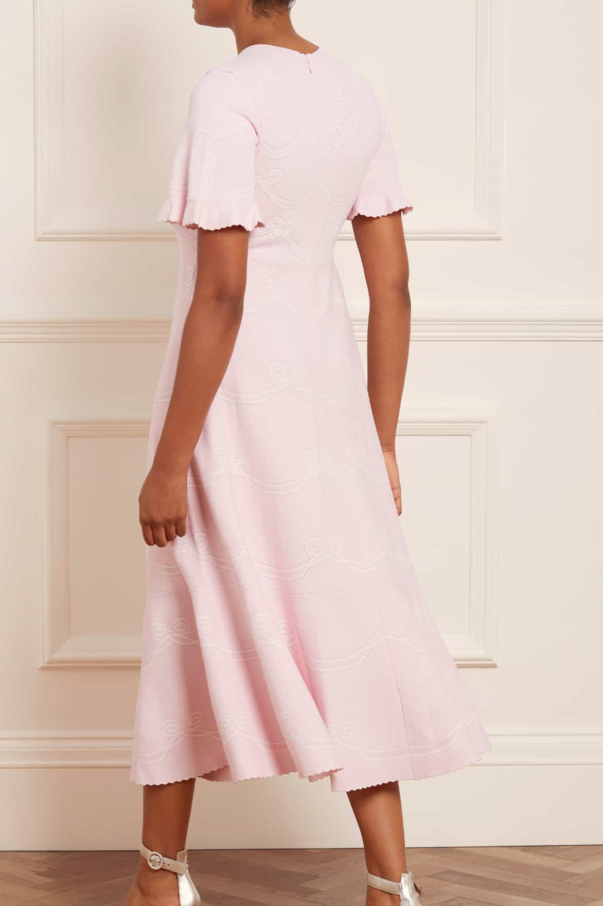 The Ribbon Bow Knit Ankle Gown in Pink / White. This gown is beautifully engineered with ribbon bow motifs creating a pretty and feminine design. Developed from a recycled viscose fabric for a flattering and comfortable fit. Designed with a delicate jacquard pattern framed with pointelle and scallop details. Crafted with a stretch bodice, round neckline and fluted cuffs for signature Needle & Thread elements. Make this gown your new favourite wardrobe staple.
