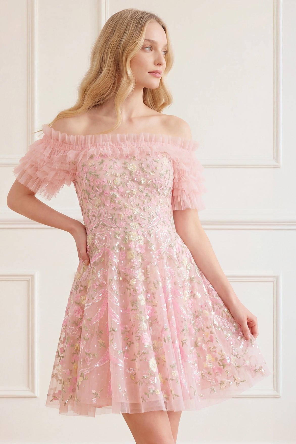 NEW SEASON. The Ribbon Heart Off-Shoulder Micro Mini Dress in Peony Pink/Multi. A playful micro mini silhouette adorned with ribbon heart motifs inspired by romantic garden details. Designed with an off-shoulder neckline, this style balances femininity with a modern, statement feel.