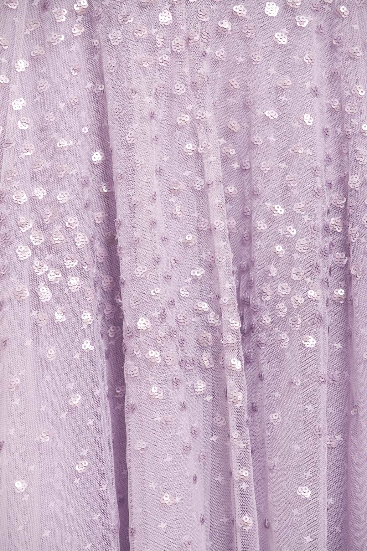 NEW SEASON. The Scallop Sequin V-Neck Ankle Gown in Lavender. Features luminous sequins cascading across soft tulle. Designed with a flattering V-neckline and flowing silhouette, this gown radiates understated elegance.
