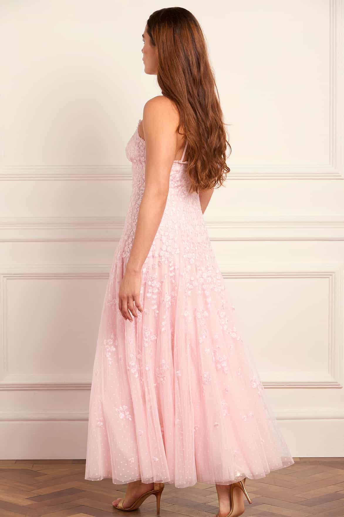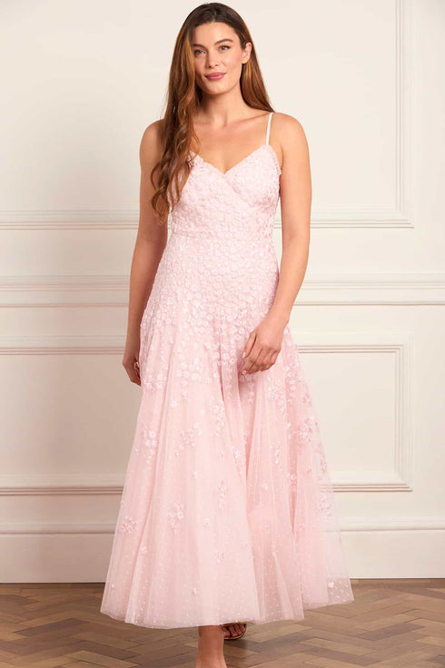NEW SEASON. The Scatter Blossom Cami Ankle Gown in Seashell. Decorated with tonal embroidery of delicate ditsy florals. Crafted from airy tulle, this gown flows gracefully for a soft, romantic finish.