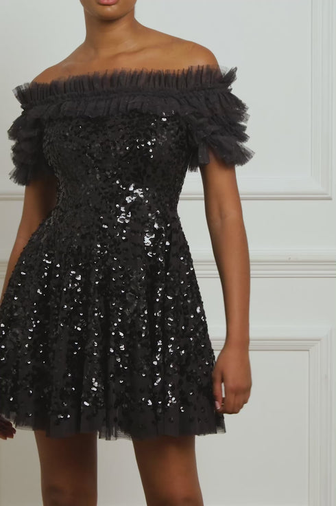 The Sequin Wreath Off-Shoulder Micro Mini Dress in Graphite. This beautiful dress is crafted with an iconic off-the-shoulder design. Adorned with layers of delicate ruffles, along with an elasticated panel for comfort and hold. This dress is beautifully decorated with shimmering sequins inspired by a vintage lace curtain. Developed with an integrated corset for the perfect shape and structure. A truly magical piece.